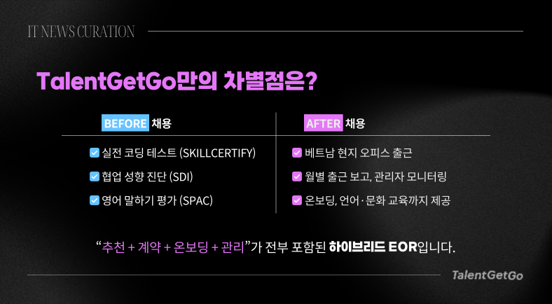 | TalentGetGo | 한국·베트남 | 개발자 특화, 실력 검증 + 현지 관리 + 교육까지 통합 제공 |