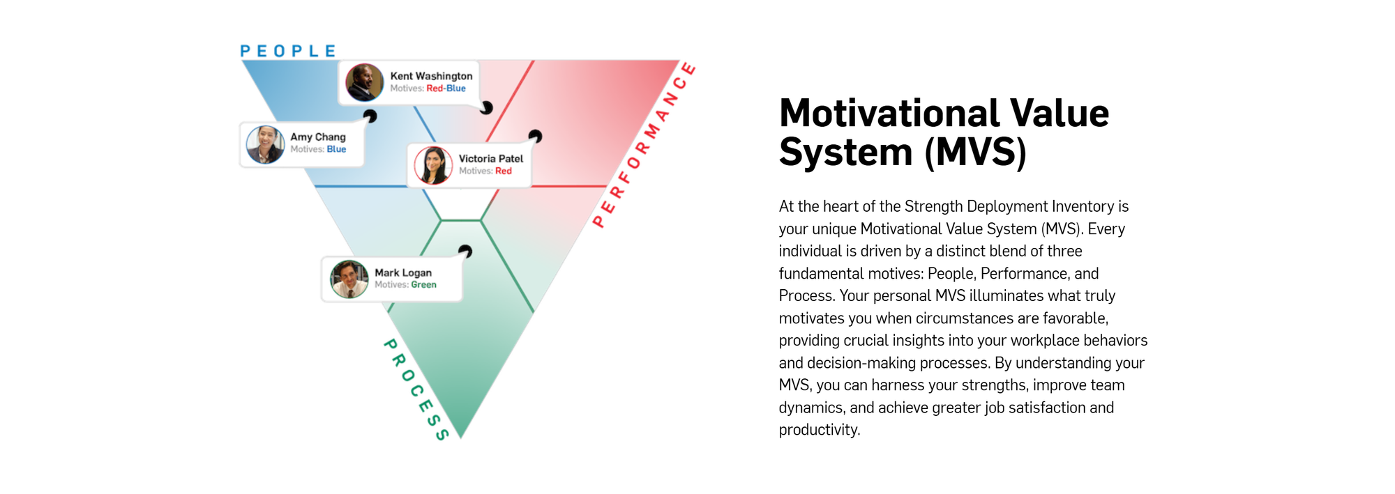 SDI는 지원자가 업무 중 어떤 동기를 중요시하는지, 스트레스 상황에서 어떤 반응을 보이는지 등을 컬러 기반 프로파일로 시각화해 줍니다.