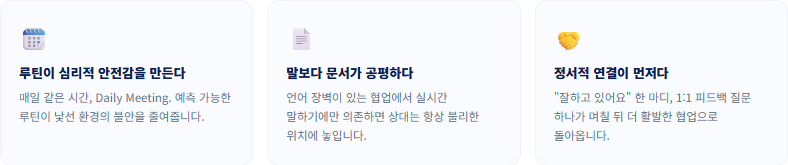 돌이켜보면, 외국인 원격 개발자 온보딩에서 가장 중요한 건 시스템이 아니었어요. 물론 Notion 가이드, 협업 툴 세팅, Daily 미팅 루틴 모두 필요했습니다. 하지만 그것들은 도구였고, 핵심은 다른 데 있었어요.