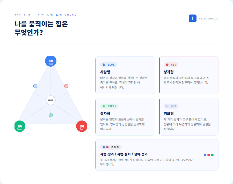 SDI는 세 가지 핵심 동기인 사람(Blue), 성과(Red), 절차(Green)의 조합으로 7가지 유형을 만들어냅니다.