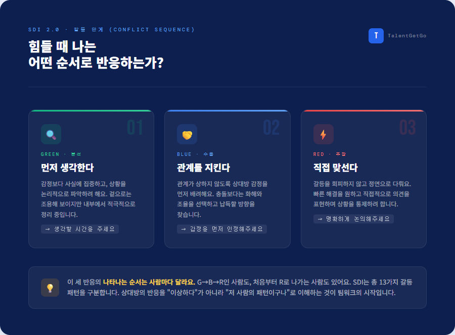 가장 중요한 건 이 세 가지 반응이 나타나는 순서가 사람마다 다르다는 점이에요. 어떤 사람은 분석(Green) → 수용(Blue) → 주장(Red) 순서로, 어떤 사람은 처음부터 주장(Red)으로 나가고 이후 분석(Green)으로 돌아와요. 두 반응이 동시에 나타나는 패턴도 있어요. SDI는 이 조합에 따라 총 13가지 갈등 패턴을 구분합니다.