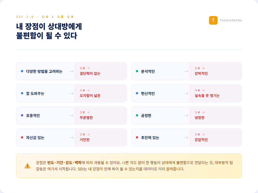 여기서 SDI가 정말 독특해집니다. 강점은 잘 쓰면 팀에 큰 기여를 하지만, 너무 자주, 너무 강하게, 혹은 맞지 않는 상황에서 쓰면 상대방 눈에는 부정적으로 보일 수 있어요. 이를 SDI에서는 '과용 강점'이라고 부릅니다.